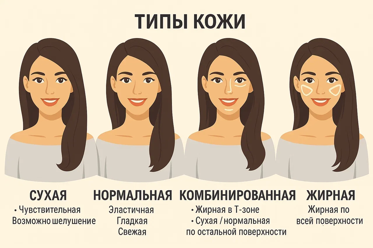 Тип кожи — это базовая характеристика, но её легко спутать с временным состоянием. Проведите простую проверку: примите тёплый душ, не наносите средства, подождите 30–60 минут и оцените ощущения. Если кожа стянута и шелушится — склонность к сухости; если блестит и остаётся липкой — склонность к жирности; если появляются покраснения или пощипывание — чувствительность; если ничего выраженного — нормальная. Важно помнить: климат, гормоны и лекарства меняют картину, поэтому диагноз «тип кожи» — это отправная точка, а не приговор.