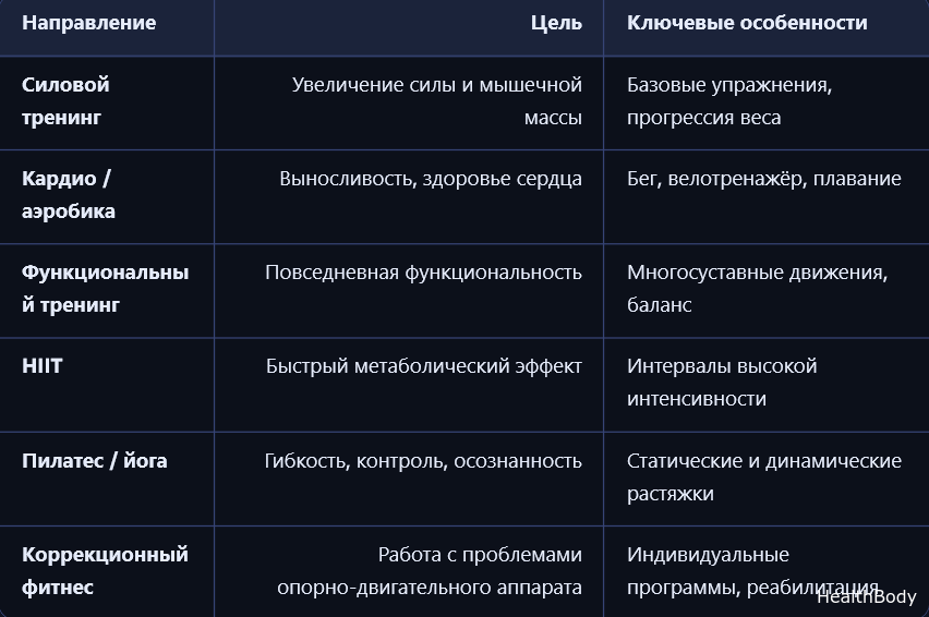 Фитнес включает множество направлений; каждое имеет свою цель и методику.